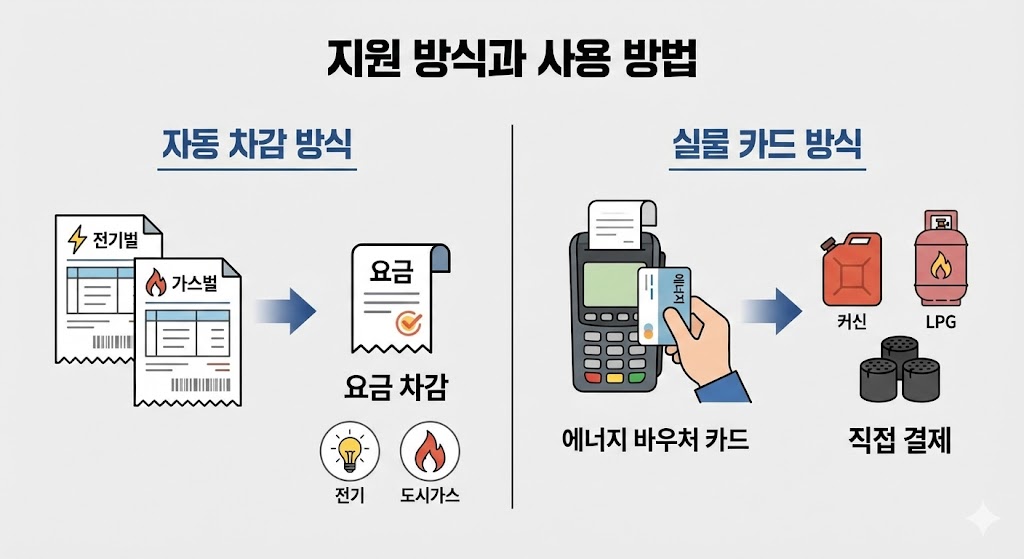 가스나 전기처럼 기본 요금이 자동 청구되는 경우에는 요금 자동 차감 방식으로 적용됩니다. 반면 등유·연탄·LPG를 사용하는 가구는 카드형 바우처로 지급돼 결제 방식으로 사용할 수 있는 것이 특징입니다.